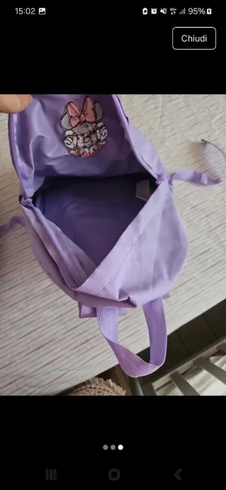 Zainetto per bambini con un simpatico disegno di Minnie. - Colore viola vivace. - Patch ricamato di Minnie con fiocco. - Bretelle regolabili. Con nome Maria Anna