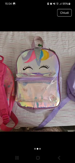 Zainetto per l'asilo con un simpatico unicorno. - Colore: lilla - Materiale: tessuto lucido - Spalline regolabili