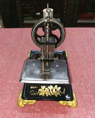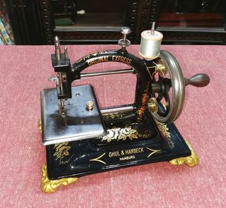 Antica macchina per cucire Ghul & Harbeck 'Original express' del 1870', restaurata, meccanismo scorrevole ma non funzionante, oggetto da esposizione molto raro e da collezione. - Base decorata con motivi floreali dorati. - Volantino in metallo con ingranaggi. - Filo per cucire presente sulla bobina.