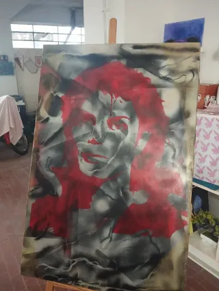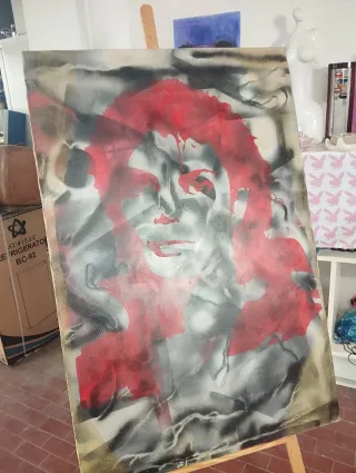 Dipinto astratto realizzato con colori acrilici su tela. - Soggetto con figura stilizzata e volto espressivo. - Colori vivaci e contrastanti. - Firma dell'artista Michevia in basso a destra.