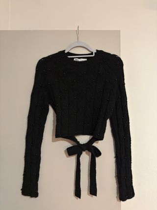 Maglione crop Zara con dettaglio perizoma sul retro. - Maniche lunghe. - Tessuto lavorato. - Perline decorative applicate.