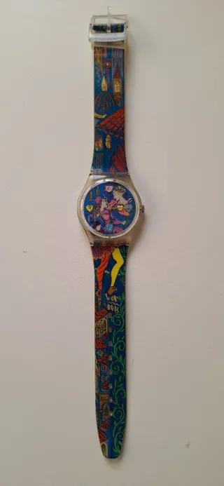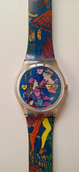 Orologio Swatch Gent Romeo & Giulietta della collezione vintage. Un pezzo unico per gli appassionati. - Design ispirato a Romeo e Giulietta. - Quadrante multicolore con dettagli artistici. - Cinturino blu con pattern elaborato. Senza scatola, batteria scarica non testato