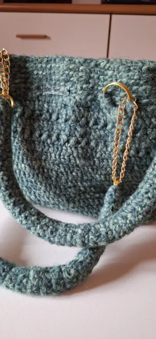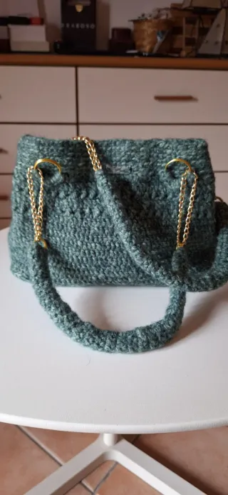 Borsa a mano o a spalla, realizzata artigianalmente con cura. - Materiale in filato lavorato a maglia. - Dettagli con catena color oro. - Manico intrecciato per una presa comoda. In lana verde melange fodera al fondo e chiusura con bottone magnetico