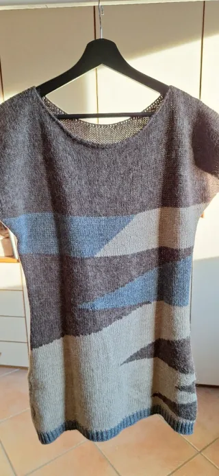 Abito midi in maglia con un design a blocchi di colore. - Scollo rotondo. - Lunghezza al ginocchio. - Tessuto a maglia. Caldo e morbido, una percentuale di lana e mohair senza etichetta taglia presumibilmente taglia M tutte le misure nelle foto #maximaglia #maglia #abito