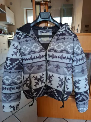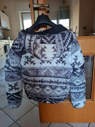 Giubbino unisex con una fantasia geometrica che alterna diverse tonalità di grigio e bianco. - Design moderno e accattivante. - Cappuccio integrato. - Tasche laterali con zip.