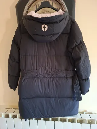 Giaccone invernale da donna, un capo caldo e alla moda. - Cappuccio integrato. - Chiusura frontale con zip e bottoni. - Tasche anteriori con patta. - Dettagli con fibbia sulla cintura posteriore.