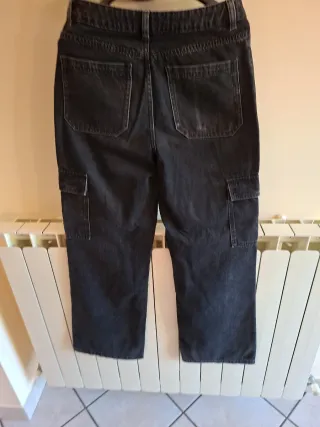 Pantaloni cargo da donna in denim nero. Modello comodo e versatile. - Tasche laterali applicate. - Vita alta. - Gamba dritta.