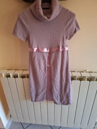 Elegante vestito con un tocco di colore. - Scollo alto a cappuccio. - Maniche corte. - Cintura in raso rosa. - Apertura frontale.