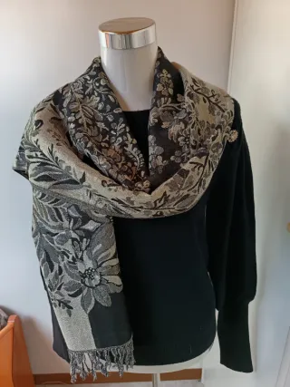 Elegante foulard o coprispalle con un motivo floreale intricato e dettagli dorati. - Motivo floreale su base nera. - Dettagli in filo dorato. - Frange decorative sul bordo.