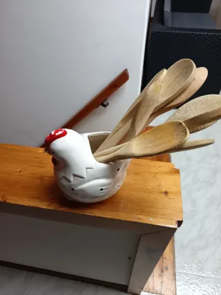 Grazioso portacucchiai a forma di gallina, perfetto per organizzare i tuoi utensili da cucina. - Design originale a forma di gallina. - Realizzato in ceramica bianca con dettagli colorati. - Include diversi cucchiai in legno.