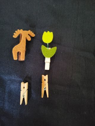 Set di mollette decorative con simpatici disegni. - Molletta a forma di giraffa marrone. - Molletta a forma di tulipano verde. - Due mollette in legno naturali.