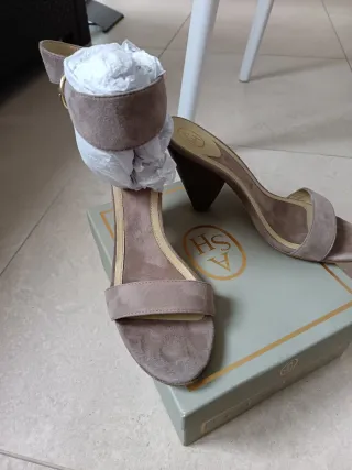 Eleganti sandali Ash con un design raffinato. Tacco alto cm 11 - Materiale scamosciato color beige. - Dettagli dorati. - Cinturino alla caviglia per una calzata sicura. Pagati 120 euro