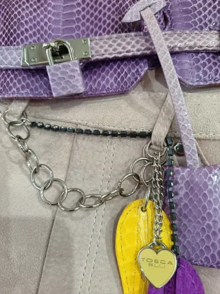 Borsa a spalla firmata Tosca Blu, un accessorio unico con dettagli floreali e un simpatico insetto ricamato. - Materiale principale beige. - Dettagli in pitone viola. - Applicazioni a forma di tulipani. - Charm pendenti in pitone viola e giallo. - Ciondolo a forma di cuore con logo.