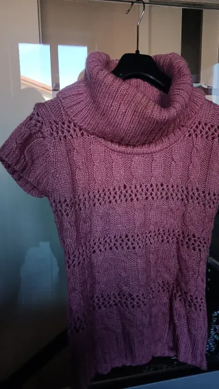Maglione in maglia color rosa con collo alto e maniche corte. Presenta un motivo traforato e a trecce. - Design con collo alto. - Maniche corte. - Motivo traforato. - Dettagli a trecce.