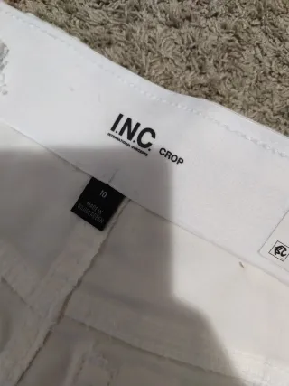 Pantalone bianco gamba ampia da donna, mai utilizzato, presente ancora l'etichetta originale. ATTENZIONE!: il pantalone ha uno strappo sul davanti (vedere ultime due foto), per cui e' necessaria cucitura