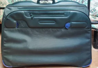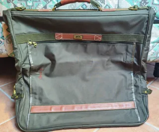 Elegante porta abiti Ghepard, ideale per trasportare fino a tre completi. - Colore verde oliva. - Dettagli in pelle. - Manico imbottito per un trasporto confortevole.