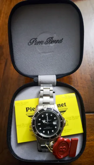 Elegante orologio da polso da uomo Pierre Bonnet con cassa e bracciale in acciaio inossidabile. Il quadrante nero presenta indici e lancette a contrasto, con dettagli che richiamano il design classico degli orologi subacquei. Non è funzionante in quanto occorre sostituire la pila - Cassa e bracciale in acciaio inossidabile. - Quadrante nero con indici a bastone. - Lunetta girevole unidirezionale con inserto nero. - Resistente all'acqua fino a 30 ATM. - Chiusura deployante con sicurezza.