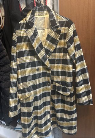 Elegante cappotto da donna con un classico motivo a quadri. Perfetto per aggiungere un tocco di stile al tuo guardaroba. - Fantasia a quadri nei toni del nero e del beige. - Design a doppio petto con bottoni. - Tasche frontali applicate.