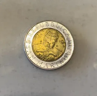 Moneta della Repubblica di San Marino. - Dritto: raffigurazione di un bambino con globo terrestre. - Rovescio: stemma della Repubblica di San Marino.