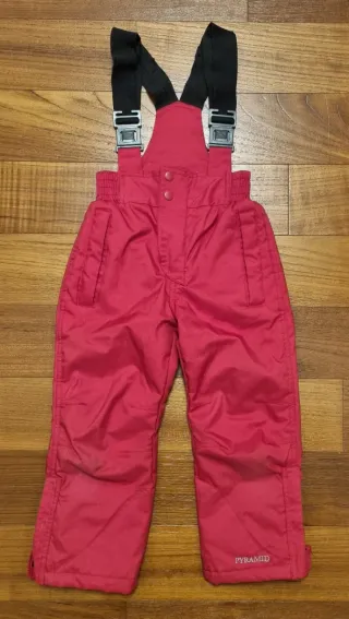 Salopette da sci per bambino, colore rosso. - Bretelle nere regolabili con fibbie. - Vita elasticizzata. - Tasche laterali. - Logo PYRAMID sul fondo gamba. - In ottimo stato