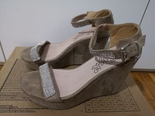 Sandali da donna con zeppa scamosciata beige e dettagli gioiello Onyx Segno di usura su sandale destro come da foto