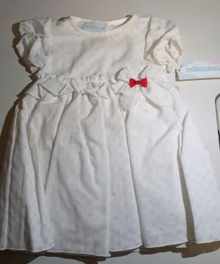 Elegante vestito per neonata, realizzato in Italia. - Tessuto bianco con pois tono su tono. - Maniche corte a sbuffo. - Volant decorativi in vita. - Fiocco rosso sul davanti.