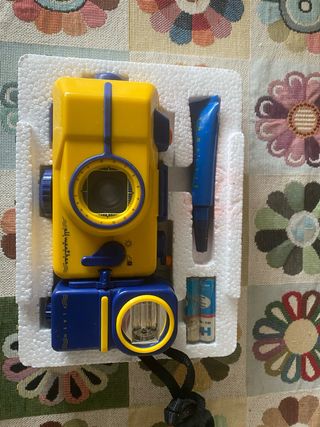 Macchina fotografica gialla, adatta a tutte le condizioni atmosferiche. - Corpo macchina in plastica resistente. - Obiettivo con ghiera blu. - Flash separato blu. - Include batterie.