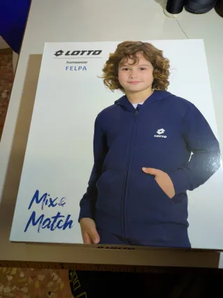 Set Lotto per bambino, ideale per il tempo libero o per stare in casa. Abbiamo di colore blu e grigio Di varie età - Felpa con cappuccio e zip. - Pantalone. - Logo Lotto.