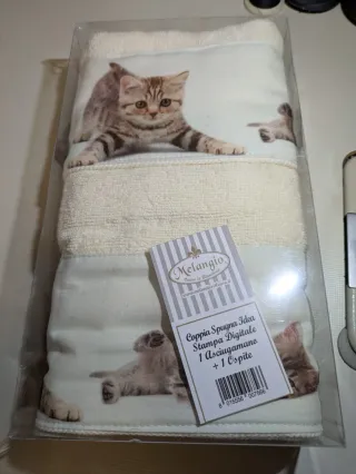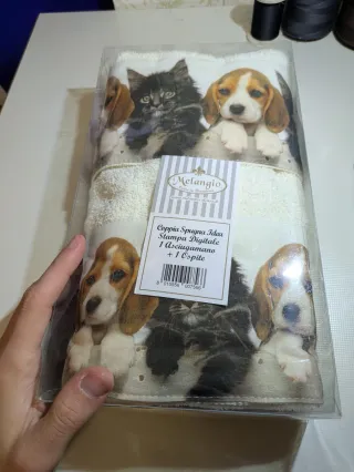 Set di due asciugamani con stampa digitale di cuccioli di cane e gatto. Vengono 18€ singolarmente - Coppia di asciugamani. - Stampa digitale con animali. - Marca: Melangio.