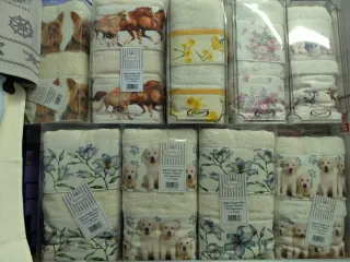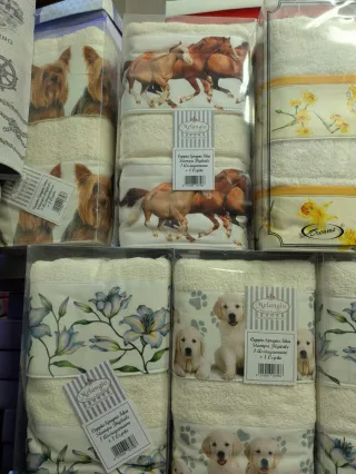 Set di coppie di asciugamani con diverse fantasie. Perfetti per aggiungere un tocco di stile al bagno. 18€ a pezzo - Modelli con cavalli, cani e fiori. - Marchi Melangio e Dreams. - Tessuto in cotone.