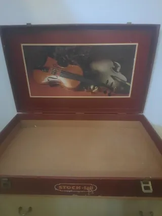 Elegante porta liquore con decorazioni a tema musicale. Anni 70 vintage Misure 38 x 61 - Coperchio decorato con violini. - Finitura esterna in similpelle bordeaux. - Interno in tessuto color crema. - Chiusure metalliche.