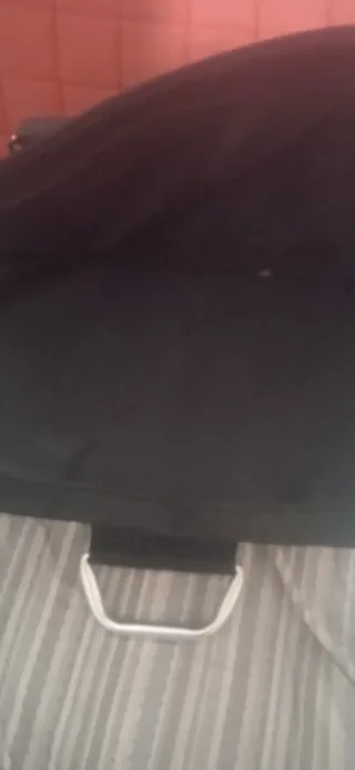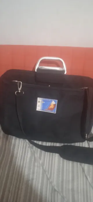 Borsa nera in tessuto, adatta per trasportare un computer portatile. - Manico superiore rigido. - Tracolla regolabile e removibile. - Tasca esterna con chiusura a zip. - Patch decorativa sul davanti.