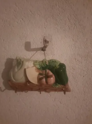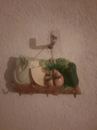 Appendino da parete in ceramica, decorato con un cesto di verdure. - Raffigurazione di verdure come pomodoro, peperone e lattuga. - Base a forma di cesto in vimini. - Dotato di ganci sottostanti per appendere oggetti.