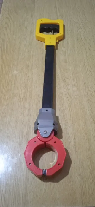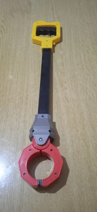 Strumento giocattolo con impugnatura gialla e pinza rossa. - Impugnatura ergonomica. - Barra di collegamento nera. - Pinza a forma ottagonale.