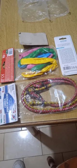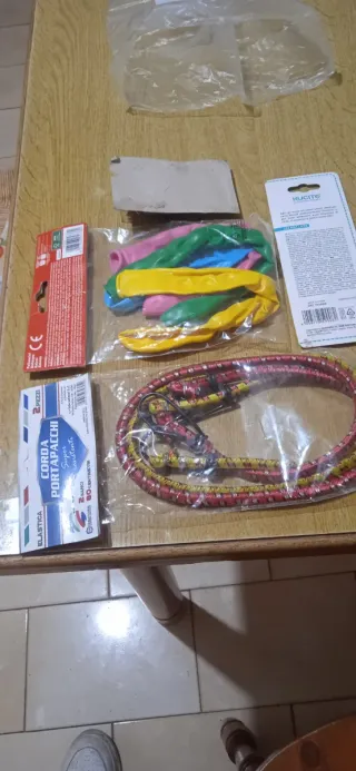 Vendo set di oggetti vari. - Palloncini colorati. - Corda elastica con ganci. - Altri articoli inclusi.