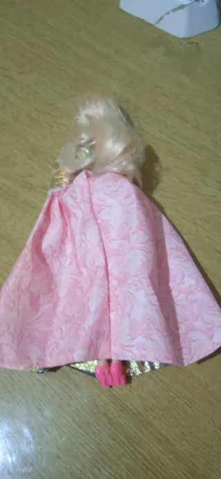 Bambola con un grazioso vestito rosa decorato. - Vestito con fantasia floreale. - Scarpe rosa. - Capelli biondi.