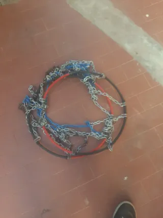 Set di catene da neve per pneumatici. - Catene in metallo. - Rete di maglie metalliche. - Fissaggi in gomma rossa e nera. - Catene aggiuntive di colore blu.
