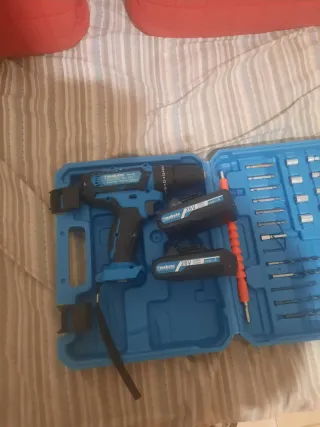 Trapano avvitatore Makete con due batterie da 26V. - Colore blu e nero. - Include valigetta. - Set di punte e inserti inclusi.