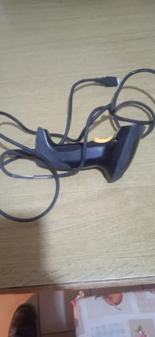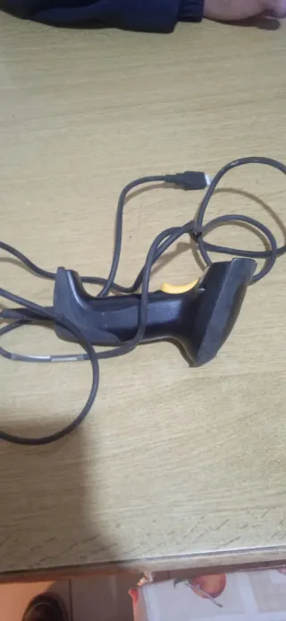 Lettore di codici a barre nero con cavo USB e supporto. - Design ergonomico. - Pulsante di scansione giallo. - Cavo di connessione USB incluso.