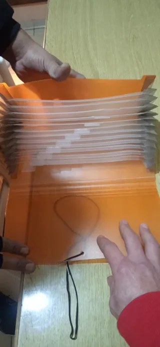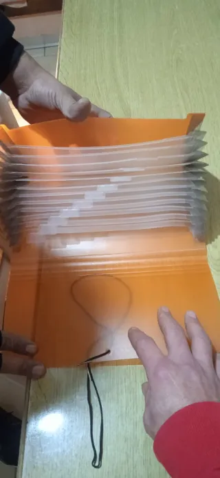 Portadocumenti espandibile in plastica arancione, ideale per organizzare fogli e documenti. - Design a fisarmonica con molteplici scomparti. - Chiusura con elastico per una maggiore sicurezza. - Materiale plastico resistente.