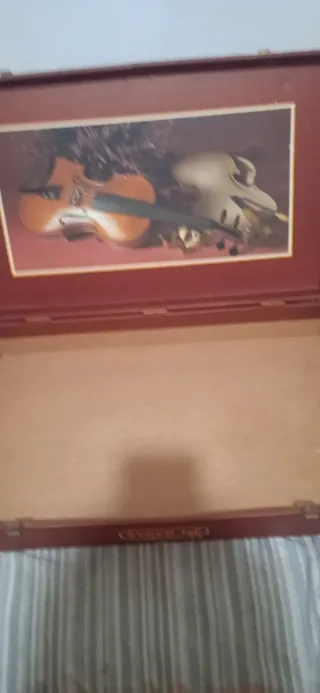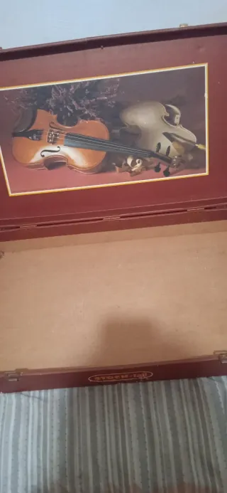 Elegante scatola porta liquori con una stampa decorativa sulla parte superiore. - Stampa raffigurante due violini. - Finitura esterna in colore bordeaux. - Interno in legno chiaro.