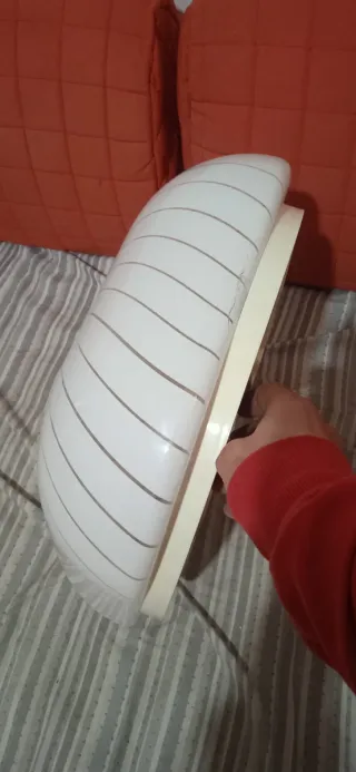 Plafoniera moderna da soffitto con un design elegante e linee curve. La finitura bianca è arricchita da sottili strisce decorative che creano un effetto visivo unico. - Copertura in vetro satinato. - Base di fissaggio in materiale plastico. - Design a spirale.