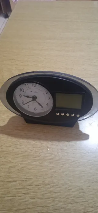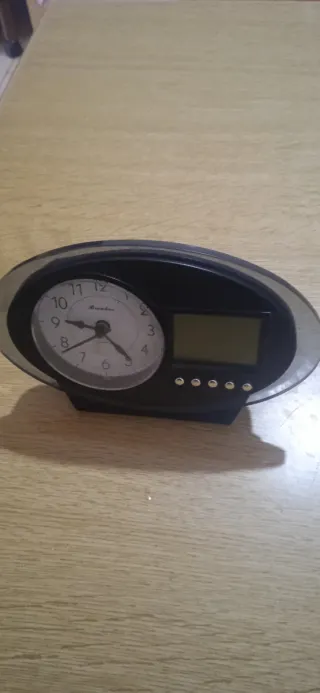 Elegante orologio da tavolo con funzione sveglia integrata. Il design moderno si adatta a qualsiasi ambiente. - Quadrante analogico con numeri chiari. - Display digitale aggiuntivo. - Pulsanti di controllo sul lato.