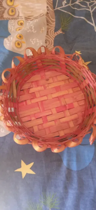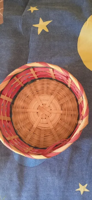 Cestino rotondo realizzato con tecnica intrecciata. - Materiale: bambù - Colore: arancione e marrone - Decorazione: bordo con anelli intrecciati