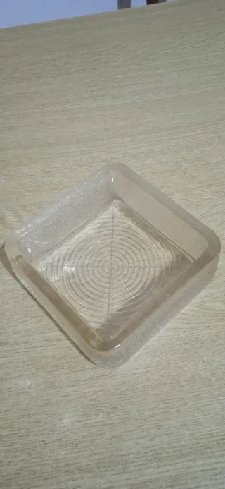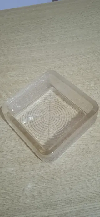 Elegante posacenere in vetro trasparente, con una forma quadrata e un design interno a cerchi concentrici. - Materiale: Vetro - Forma: Quadrata - Finitura interna: Cerchi concentrici