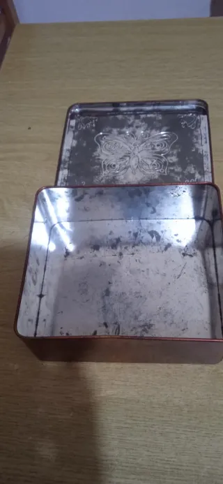 Elegante scatola porta oggetti con un design unico. - Decorazione a farfalla sulla parte superiore. - Materiale metallico resistente.