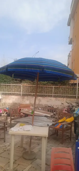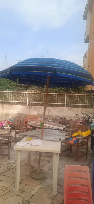 Ombrellone da giardino con strisce blu e verdi. Ideale per creare ombra all'esterno. - Tessuto a righe blu e verdi. - Struttura con palo centrale.