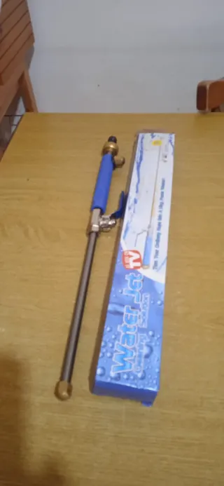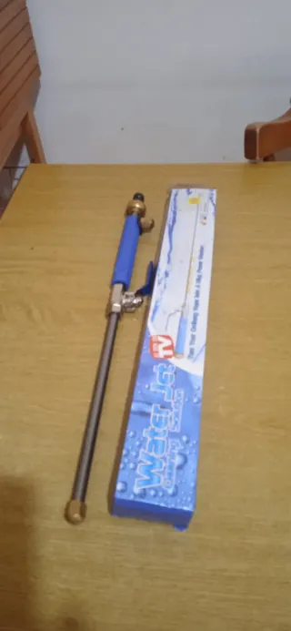 Tubo per idropulitrice Water Jet con impugnatura blu e dettagli in metallo. - Ideale per pulire vialetti e superfici. - Design ergonomico con leva per il controllo del flusso d'acqua.