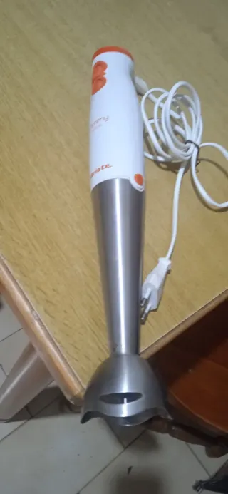 Frullatore a immersione Ariete, ideale per preparare frullati e salse. - Corpo in plastica bianca e arancione. - Asta in acciaio inossidabile. - Cavo di alimentazione bianco.