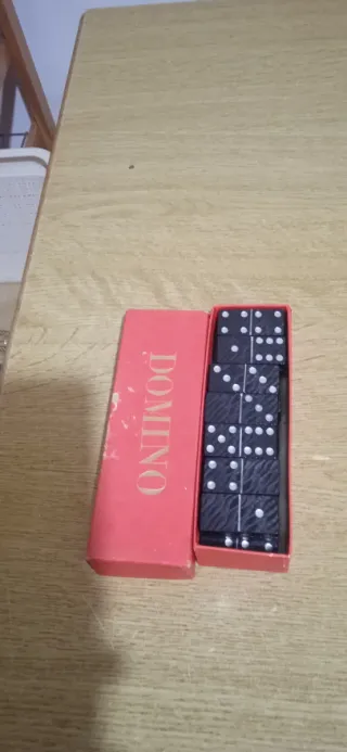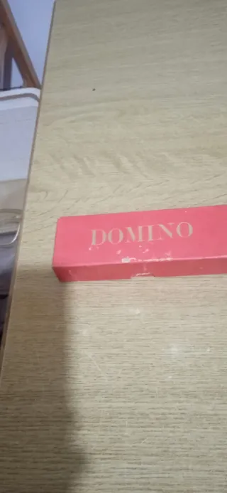 Scatola per il gioco dei domino. La scatola è di colore rosso. - Scritta DOMINO dorata sul coperchio.